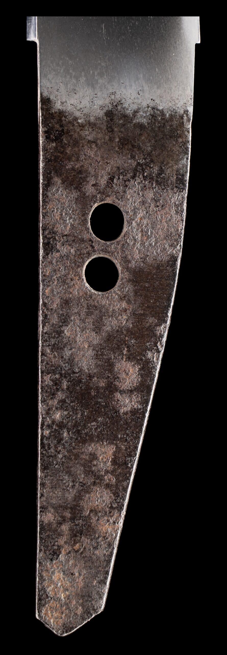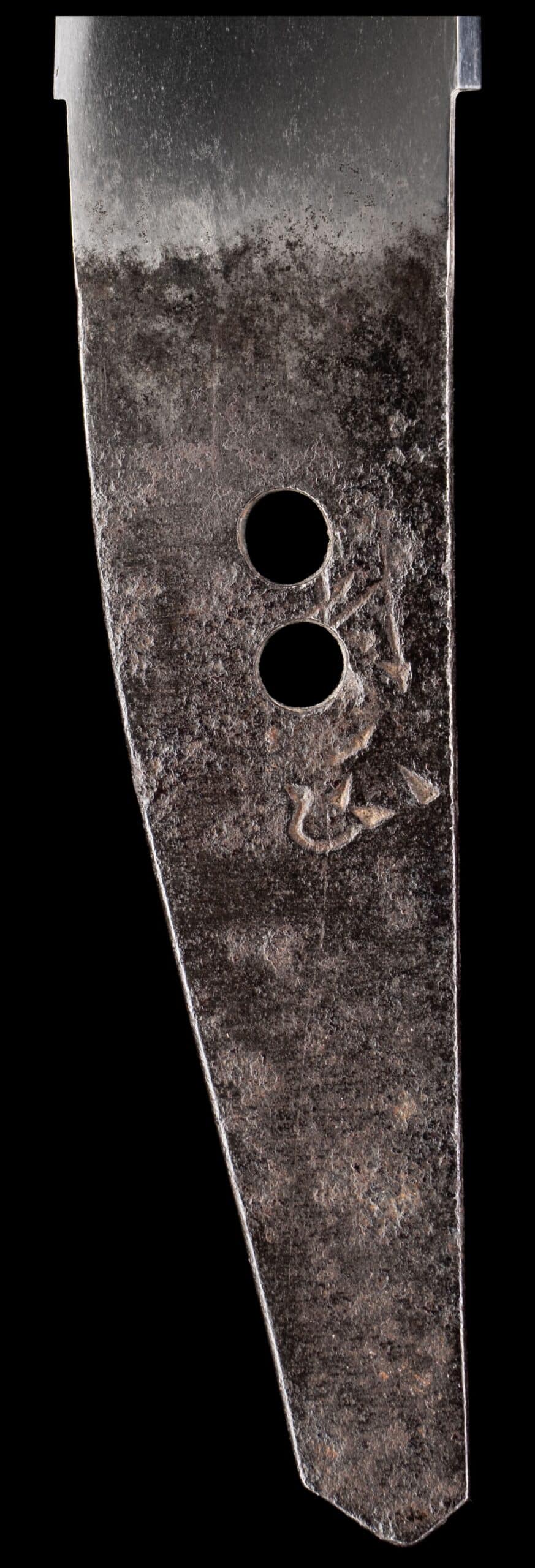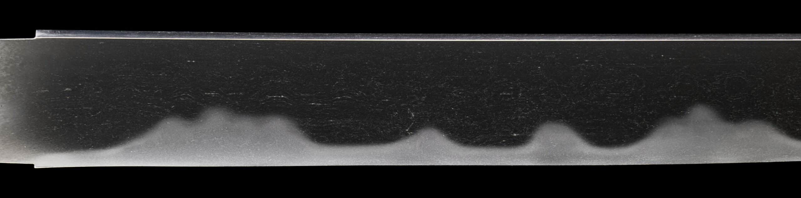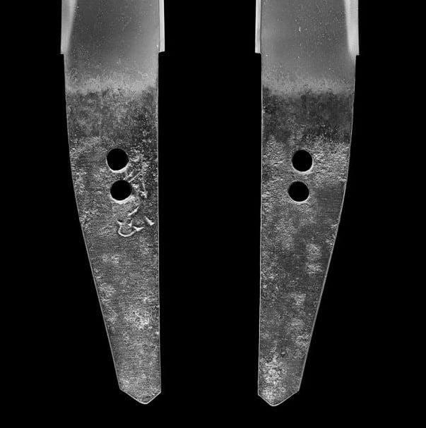 The nakago further supports the attribution. Its form, patination, and overall condition are entirely consistent with genuine late Muromachi workmanship. The presence of two mekugi-ana speaks to the blade’s long and honorable history of remounting—an expected and respected aspect of Japanese sword tradition. Importantly, the tang has not been excessively altered, preserving crucial historical evidence. Most significant of all, the mei remains intact and legible.