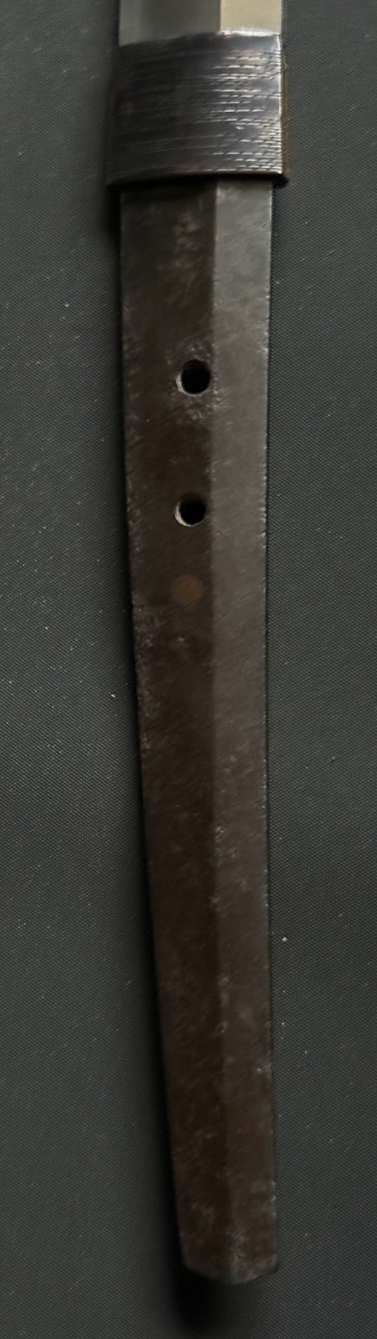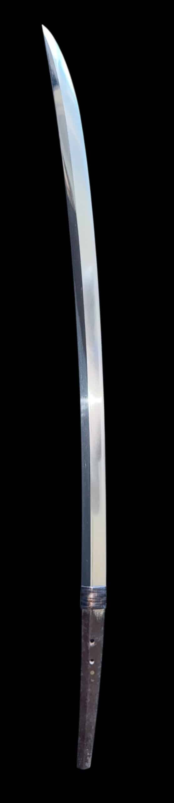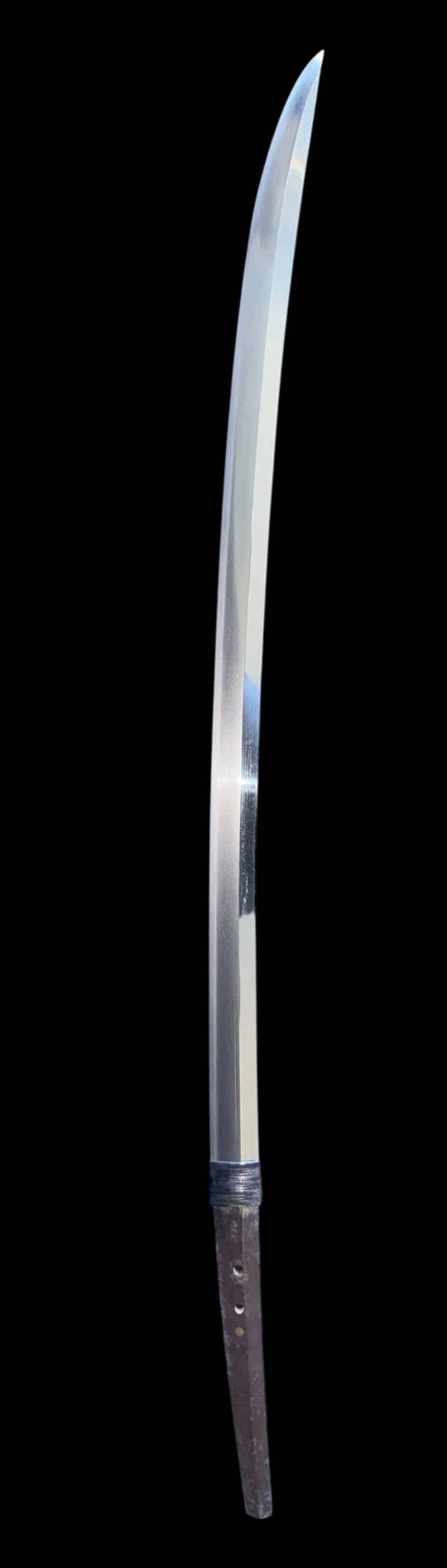 Originally forged as a nagamaki, this blade was later shortened (naoshi) into katana form. The nagamaki was a pole-mounted weapon favored in the late Kamakura and Nanbokuchō periods for its extended reach and powerful cutting ability.