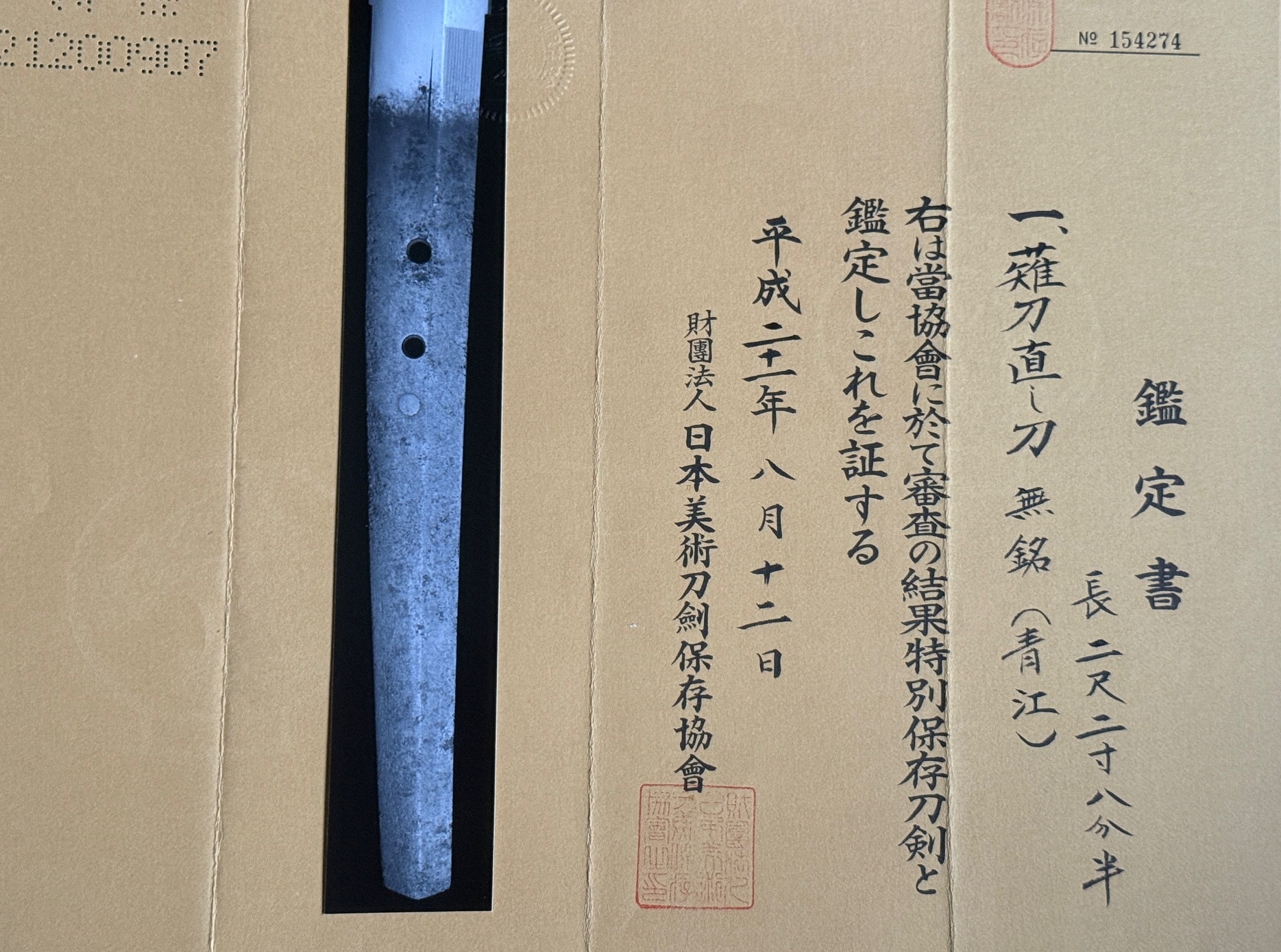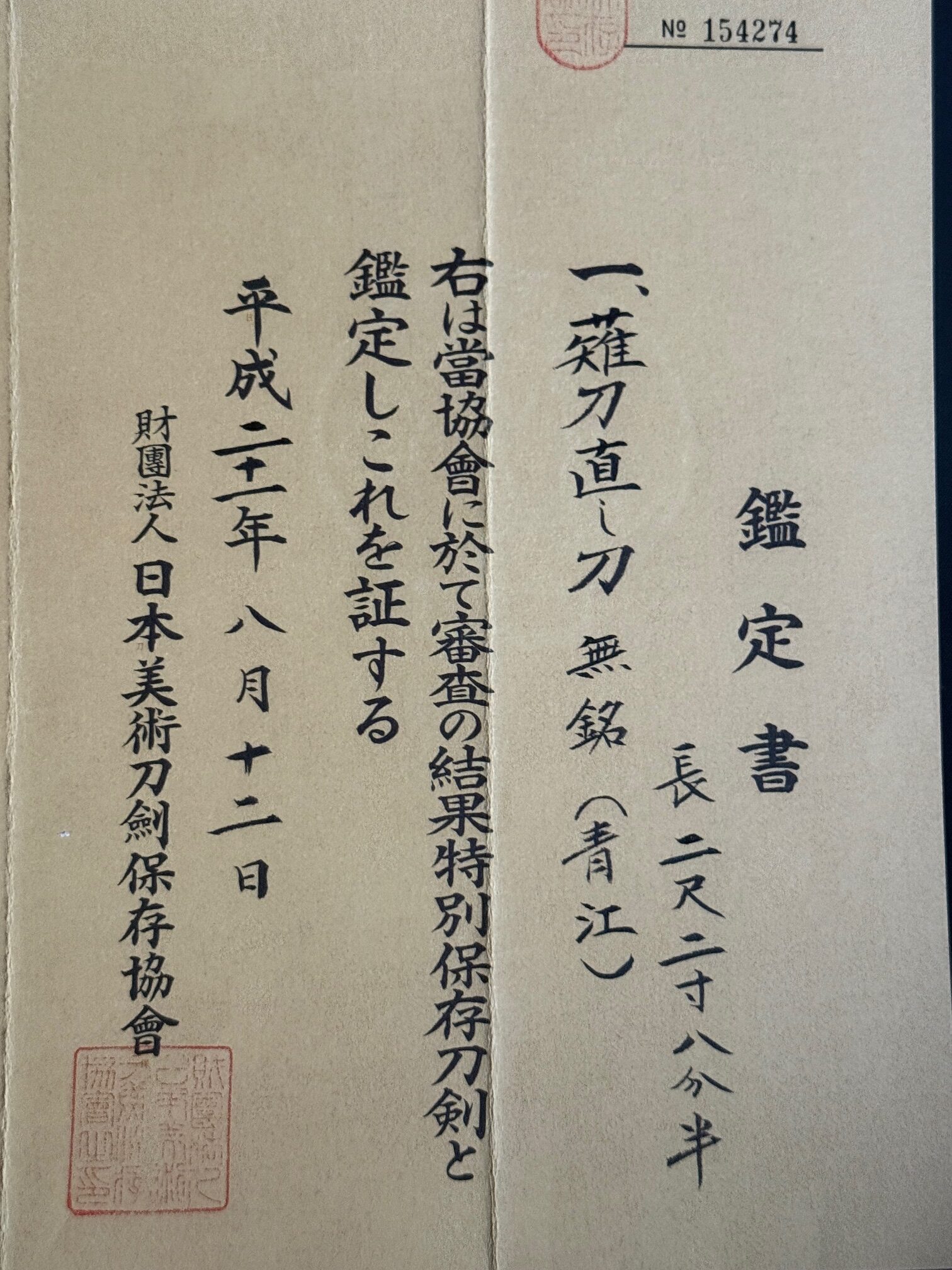 Certification by the NBTHK at the Tokubetsu Hozon level confirms: