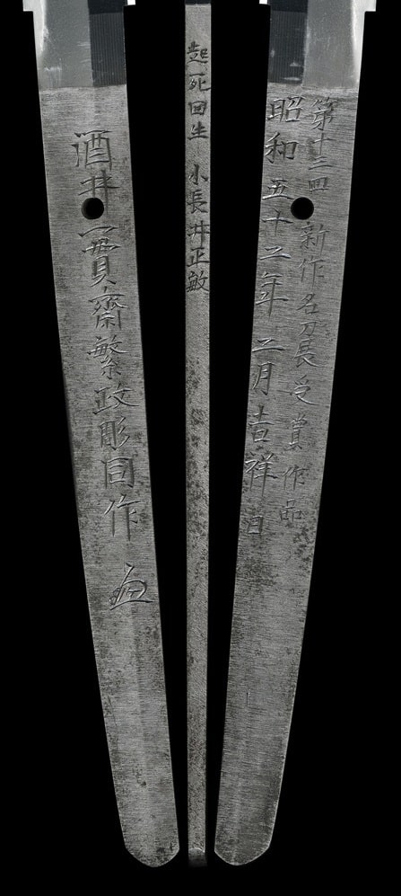 He later worked as an officially authorized swordsmith at Yasukuni Shrine, forging swords for both the army and navy. After the war he changed the character of his name from 正 to 政 and continued producing outstanding works.