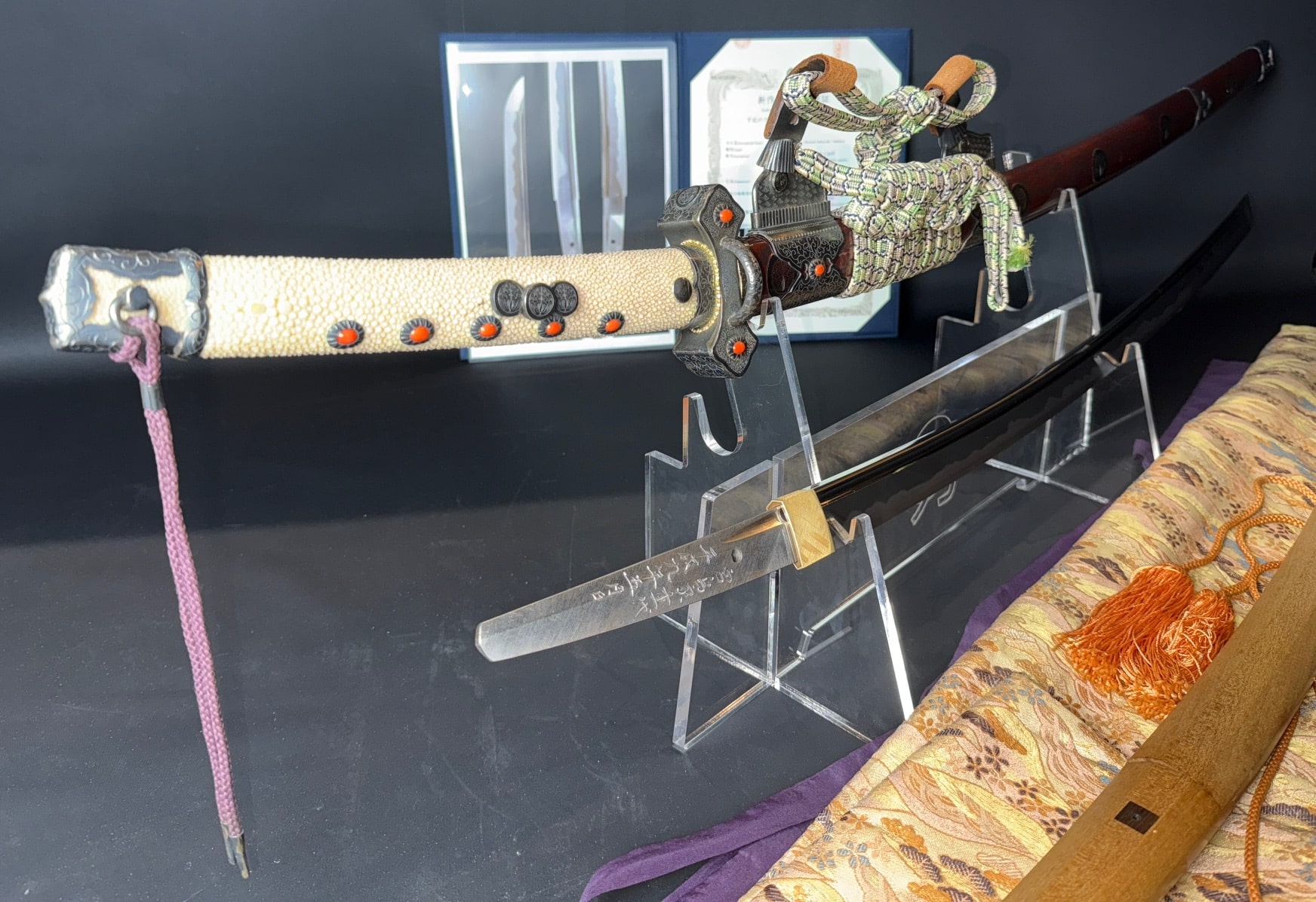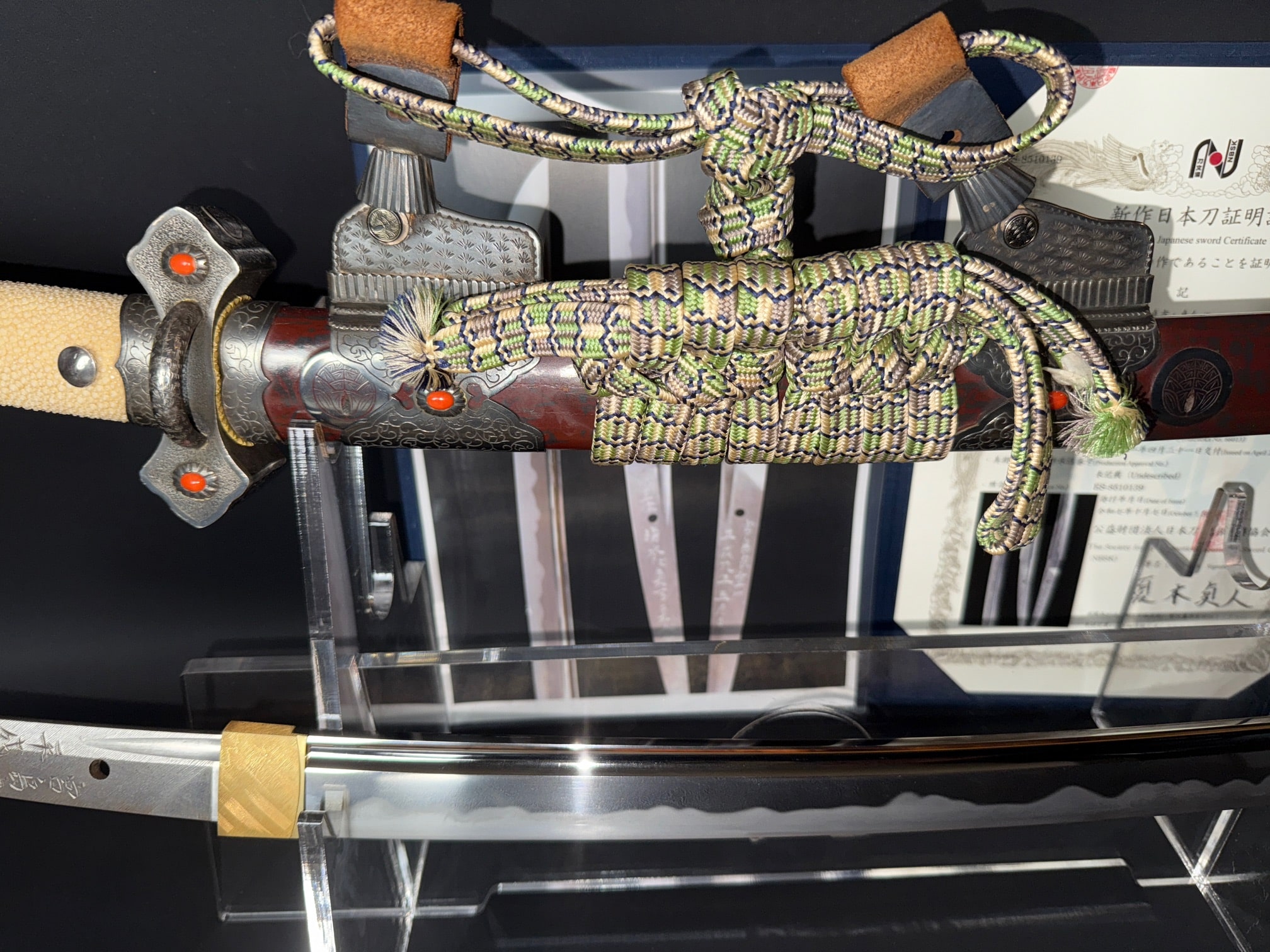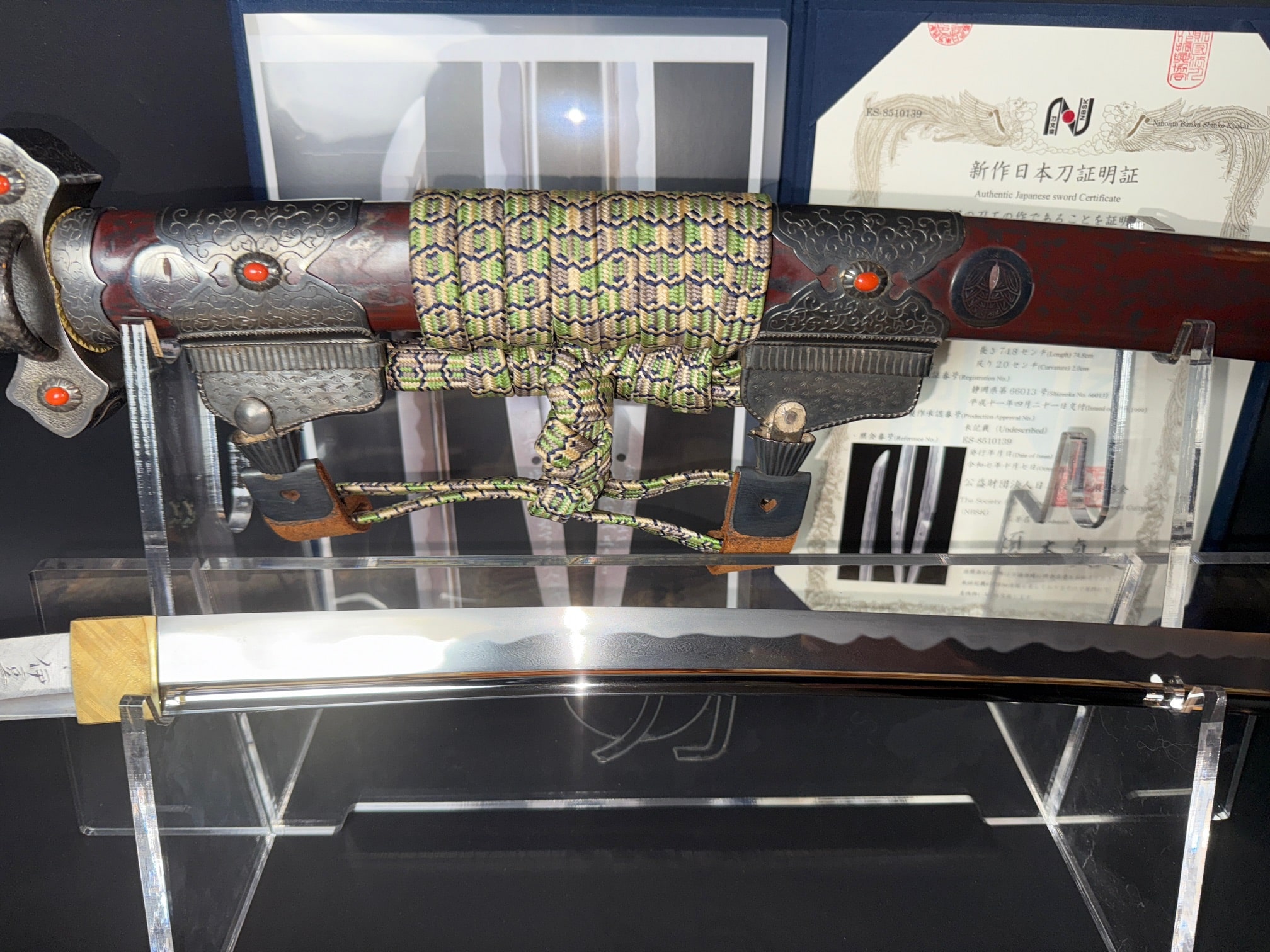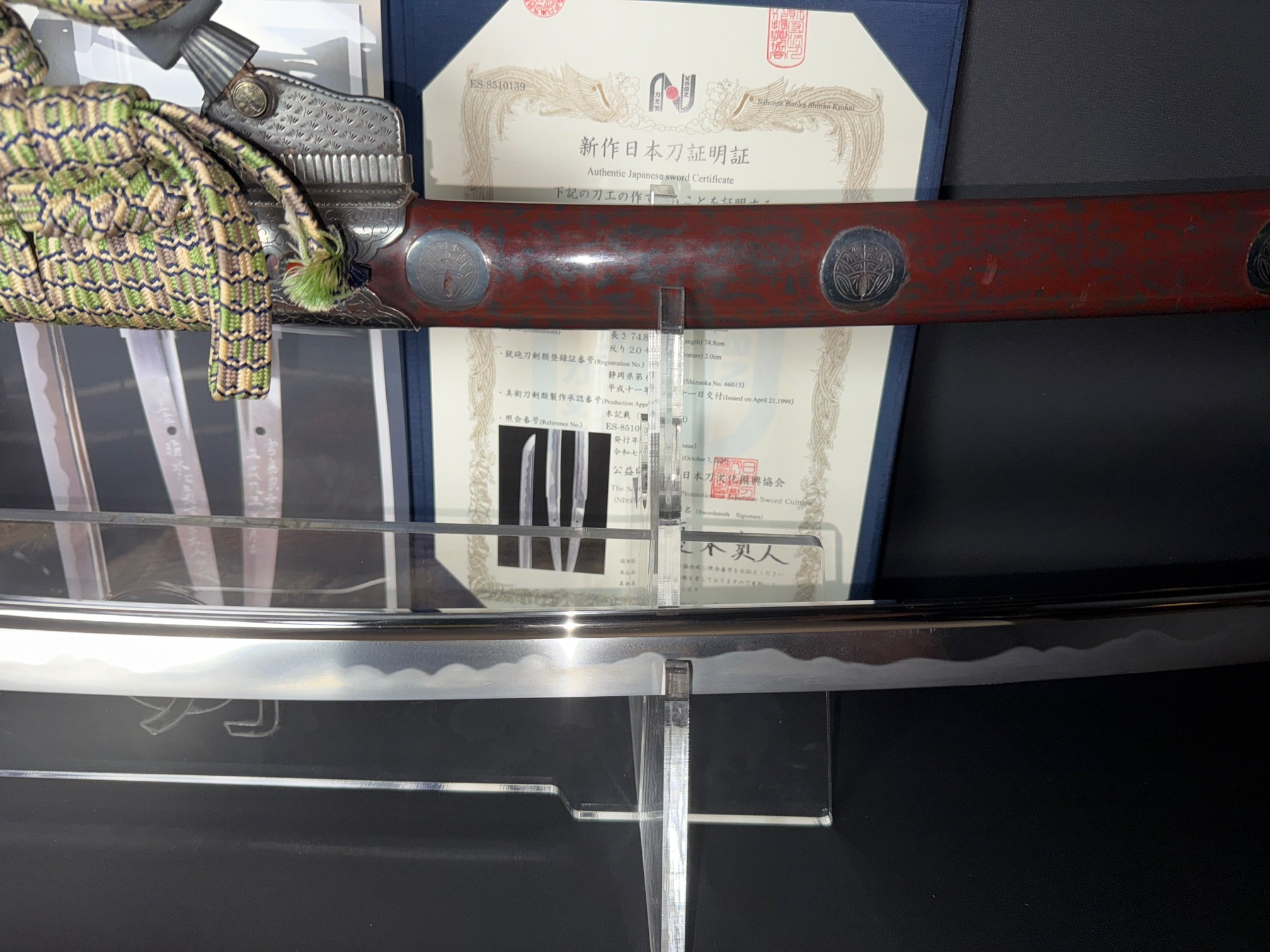 Beautiful Katana in Shirasaya with Tachi-style Koshirae(NBSK Certificate of Authenticity for Newly Made Japanese Sword)Signature: Izu ju Yusuishin Sadayoshi / Sadahito gassaku(Collaborative work by Sadayoshi and Sadahito)Date: May, 1997 (Heisei 9) – Miyajima Family HeirloomInscription: 伊豆住湧水心貞吉・貞人合作 (無監査刀匠) / 平成九年五月宮島家重代ClassificationJapanese swords are traditionally evaluated in four categories:Saijō Saku (Supreme Masterwork)Jōjō Saku (Upper Superior Work)Jō Saku (Superior Work)Regular Saku (Standard Work)This katana is ranked Jōjō Saku, an Upper Superior Work, for both Yusuishin Sadayoshi and Sadahito.Sword DetailsHabaki: Single-layered gold foil habakiBlade Length: 74.8cm (29.45in)Curvature (Sori): 2.0 cm (0.79 in)Mekugi-ana (Peg Hole): 1Width at Base (Motohaba): 3.38 cm (1.33 in)Width at Tip (Sakihaba): 2.56 cm (1.01 in)Thickness at Mune (Kasane): 0.6 cm (0.24 in)Weight: 855 gramsShape and ForgingA blade of imposing form, featuring a wide body (mihaba), thick spine (kasane), deep curvature (sori), and a long extended kissaki (point).A bohi (groove) is carved on both the omote and ura sides, lending the blade both elegance and balance.The jigane (steel surface) is a Nie-deki structure forged in the Sōshū-den tradition, displaying intricate grain and vitality.The hamon is a Nie-deki gunome-midare, forming a double wave pattern, rich in sunagashi (streaming lines) and kinsuji (golden streaks).The boshi (tip temper line) is midare-komi with hakikake, resembling brushstrokes of mist.Swordsmiths and LineageThis katana is a collaboration between Yusuishin Sadayoshi and Sadahito, two swordsmiths of the modern era.Yusuishin Sadayoshi (born 1908, Meiji 41) studied under the legendary Gassan Sadakatsu, inheriting the techniques of the Gassan lineage.In 1928 (Shōwa 3), he entered Sadakatsu’s forge and, in 1943 (Shōwa 18), moved to Mishima, Shizuoka, adopting the smith name “Wakimizu” (湧水心 – Pure Spring Water).Sadayoshi was renowned for selecting the pure spring water of Mount Fuji for his forging process, believing that crystal-clear water produced the most refined steel.His blades often show traces of the Gassan ayasugi-hada (flowing grain pattern), a hallmark of the Gassan school.Later, Sadayoshi achieved Mukansa status (exempt from competition judging) and received numerous honors, including the Masamune Award, one of Japan’s highest recognitions for swordsmiths.His collaborator, Sadahito, shared the same artistic spirit and technical mastery, creating a perfectly balanced fusion of tradition and modern excellence.Koshirae (Mounting)The sword is accompanied by a Tachi-style koshirae, refined and elegant in form.Saya (Scabbard): Decorated with the Daki Myōga family crest in silver inlay.Menuki: Carved with the Daki Myōga motif.Fittings: All metal fittings (kanagu) are engraved with the same crest.Theme: The mount is adorned with stone resembling coral, adding both color and rarity.Appraisal and RemarksThis piece represents a rare collaboration between two accomplished smiths, combining the refined forging methods of the Gassan tradition with the personal artistry of Yusuishin Sadayoshi.As a custom-ordered heirloom sword, the blade has been carefully polished, preserving its beauty and precision.The harmony of hada, hamon, and overall balance exemplifies the depth of modern Japanese craftsmanship rooted in centuries of tradition.Highly recommended as a collectible masterpiece.CertificationCertificate: NBSK Certificate of Authenticity for Newly Made Japanese SwordIncluded: Complete Oshigata (rubbing of the blade inscription and temper line)