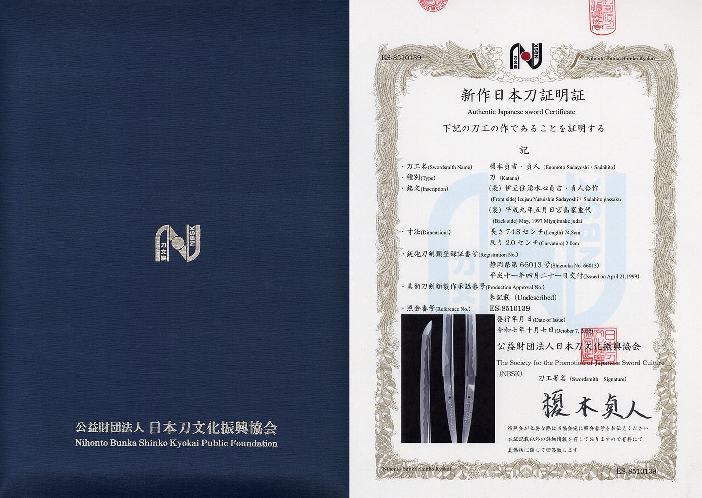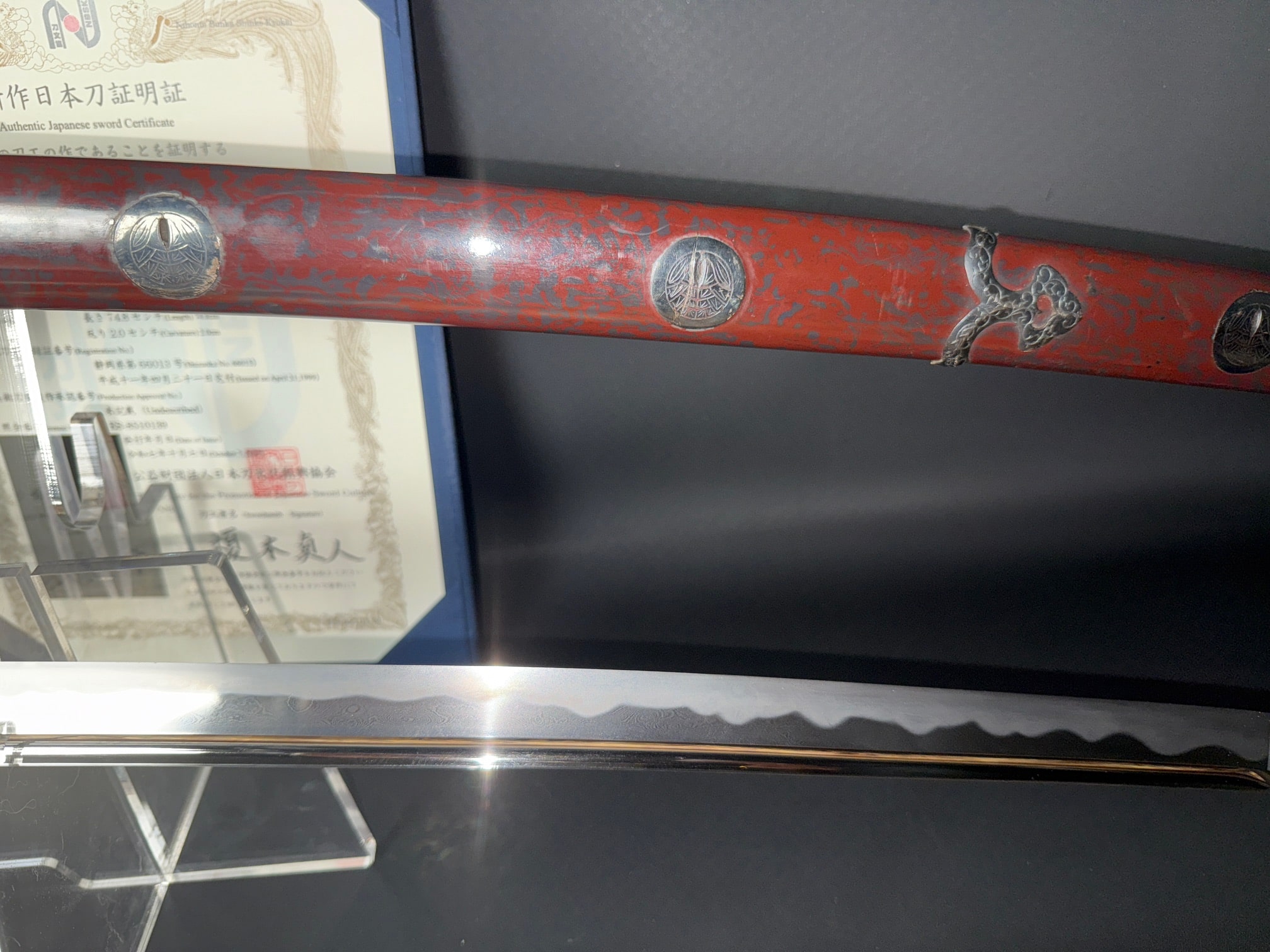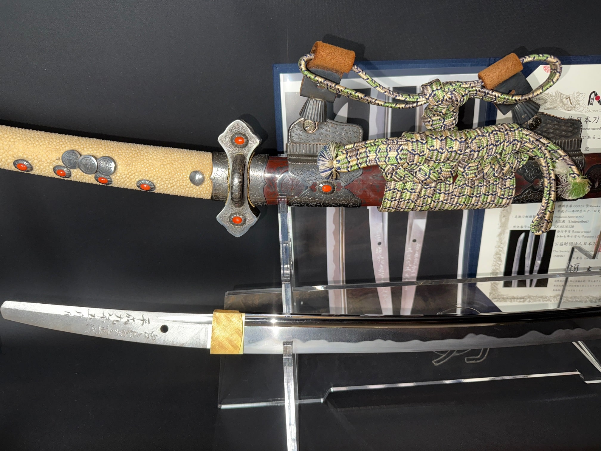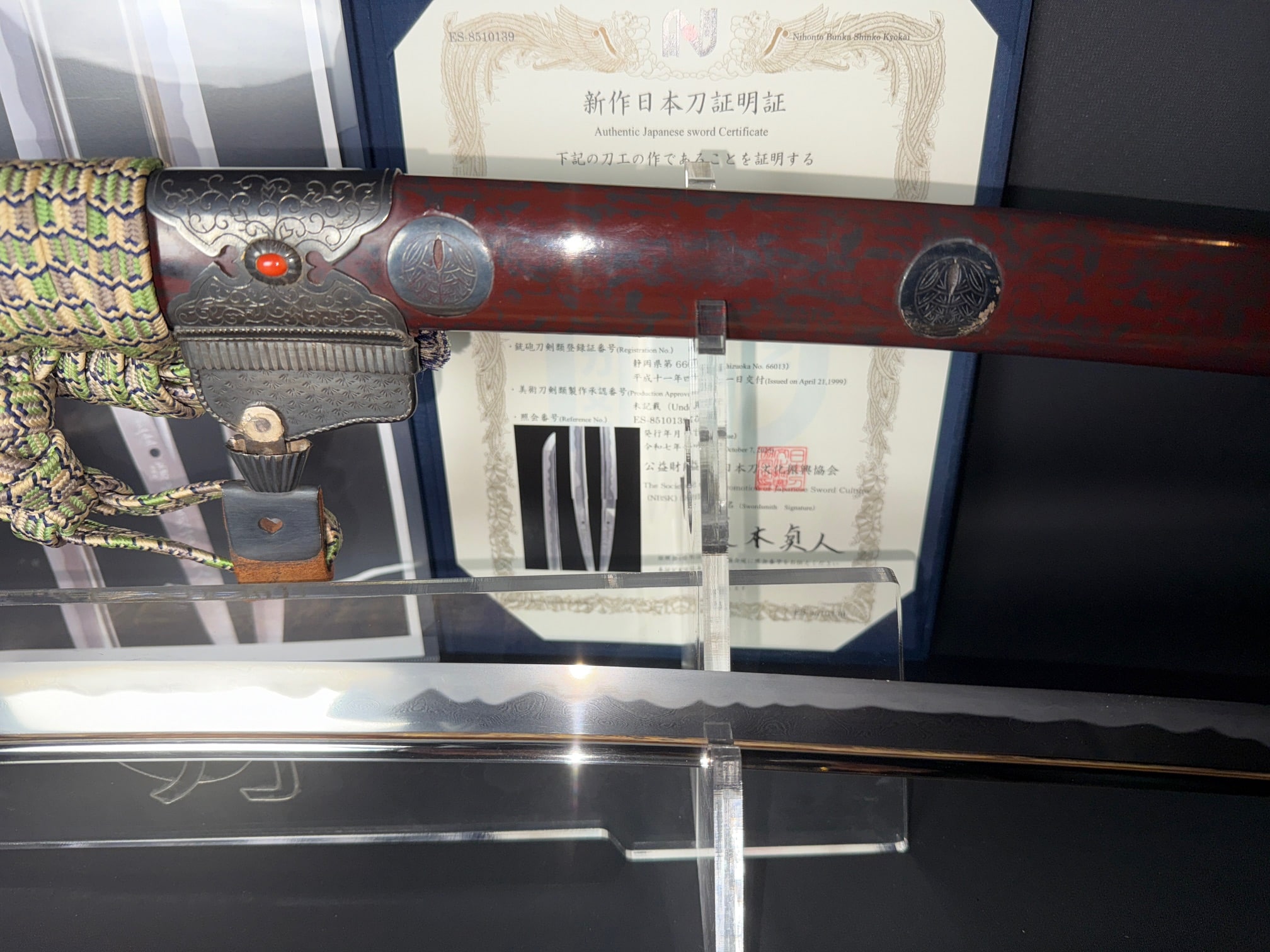 Beautiful Katana in Shirasaya with Tachi-style Koshirae(NBSK Certificate of Authenticity for Newly Made Japanese Sword)Signature: Izu ju Yusuishin Sadayoshi / Sadahito gassaku(Collaborative work by Sadayoshi and Sadahito)Date: May, 1997 (Heisei 9) – Miyajima Family HeirloomInscription: 伊豆住湧水心貞吉・貞人合作 (無監査刀匠) / 平成九年五月宮島家重代ClassificationJapanese swords are traditionally evaluated in four categories:Saijō Saku (Supreme Masterwork)Jōjō Saku (Upper Superior Work)Jō Saku (Superior Work)Regular Saku (Standard Work)This katana is ranked Jōjō Saku, an Upper Superior Work, for both Yusuishin Sadayoshi and Sadahito.Sword DetailsHabaki: Single-layered gold foil habakiBlade Length: 74.8cm (29.45in)Curvature (Sori): 2.0 cm (0.79 in)Mekugi-ana (Peg Hole): 1Width at Base (Motohaba): 3.38 cm (1.33 in)Width at Tip (Sakihaba): 2.56 cm (1.01 in)Thickness at Mune (Kasane): 0.6 cm (0.24 in)Weight: 855 gramsShape and ForgingA blade of imposing form, featuring a wide body (mihaba), thick spine (kasane), deep curvature (sori), and a long extended kissaki (point).A bohi (groove) is carved on both the omote and ura sides, lending the blade both elegance and balance.The jigane (steel surface) is a Nie-deki structure forged in the Sōshū-den tradition, displaying intricate grain and vitality.The hamon is a Nie-deki gunome-midare, forming a double wave pattern, rich in sunagashi (streaming lines) and kinsuji (golden streaks).The boshi (tip temper line) is midare-komi with hakikake, resembling brushstrokes of mist.Swordsmiths and LineageThis katana is a collaboration between Yusuishin Sadayoshi and Sadahito, two swordsmiths of the modern era.Yusuishin Sadayoshi (born 1908, Meiji 41) studied under the legendary Gassan Sadakatsu, inheriting the techniques of the Gassan lineage.In 1928 (Shōwa 3), he entered Sadakatsu’s forge and, in 1943 (Shōwa 18), moved to Mishima, Shizuoka, adopting the smith name “Wakimizu” (湧水心 – Pure Spring Water).Sadayoshi was renowned for selecting the pure spring water of Mount Fuji for his forging process, believing that crystal-clear water produced the most refined steel.His blades often show traces of the Gassan ayasugi-hada (flowing grain pattern), a hallmark of the Gassan school.Later, Sadayoshi achieved Mukansa status (exempt from competition judging) and received numerous honors, including the Masamune Award, one of Japan’s highest recognitions for swordsmiths.His collaborator, Sadahito, shared the same artistic spirit and technical mastery, creating a perfectly balanced fusion of tradition and modern excellence.Koshirae (Mounting)The sword is accompanied by a Tachi-style koshirae, refined and elegant in form.Saya (Scabbard): Decorated with the Daki Myōga family crest in silver inlay.Menuki: Carved with the Daki Myōga motif.Fittings: All metal fittings (kanagu) are engraved with the same crest.Theme: The mount is adorned with stone resembling coral, adding both color and rarity.Appraisal and RemarksThis piece represents a rare collaboration between two accomplished smiths, combining the refined forging methods of the Gassan tradition with the personal artistry of Yusuishin Sadayoshi.As a custom-ordered heirloom sword, the blade has been carefully polished, preserving its beauty and precision.The harmony of hada, hamon, and overall balance exemplifies the depth of modern Japanese craftsmanship rooted in centuries of tradition.Highly recommended as a collectible masterpiece.CertificationCertificate: NBSK Certificate of Authenticity for Newly Made Japanese SwordIncluded: Complete Oshigata (rubbing of the blade inscription and temper line)