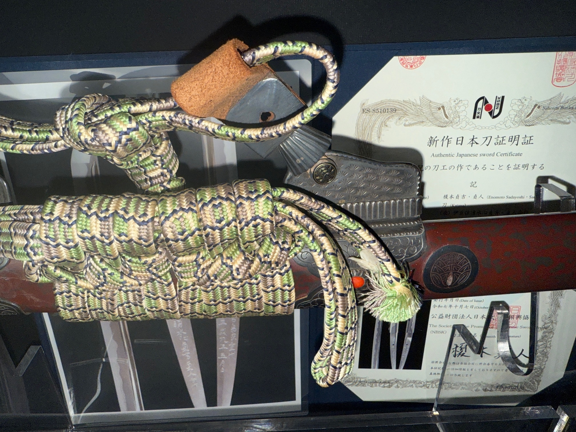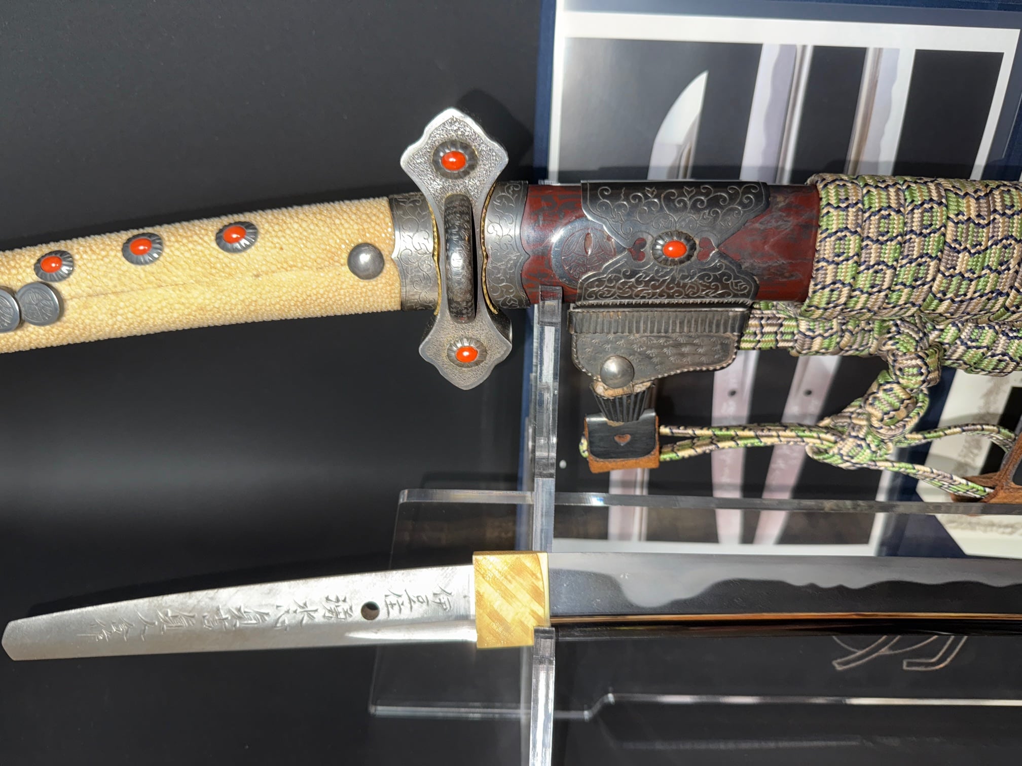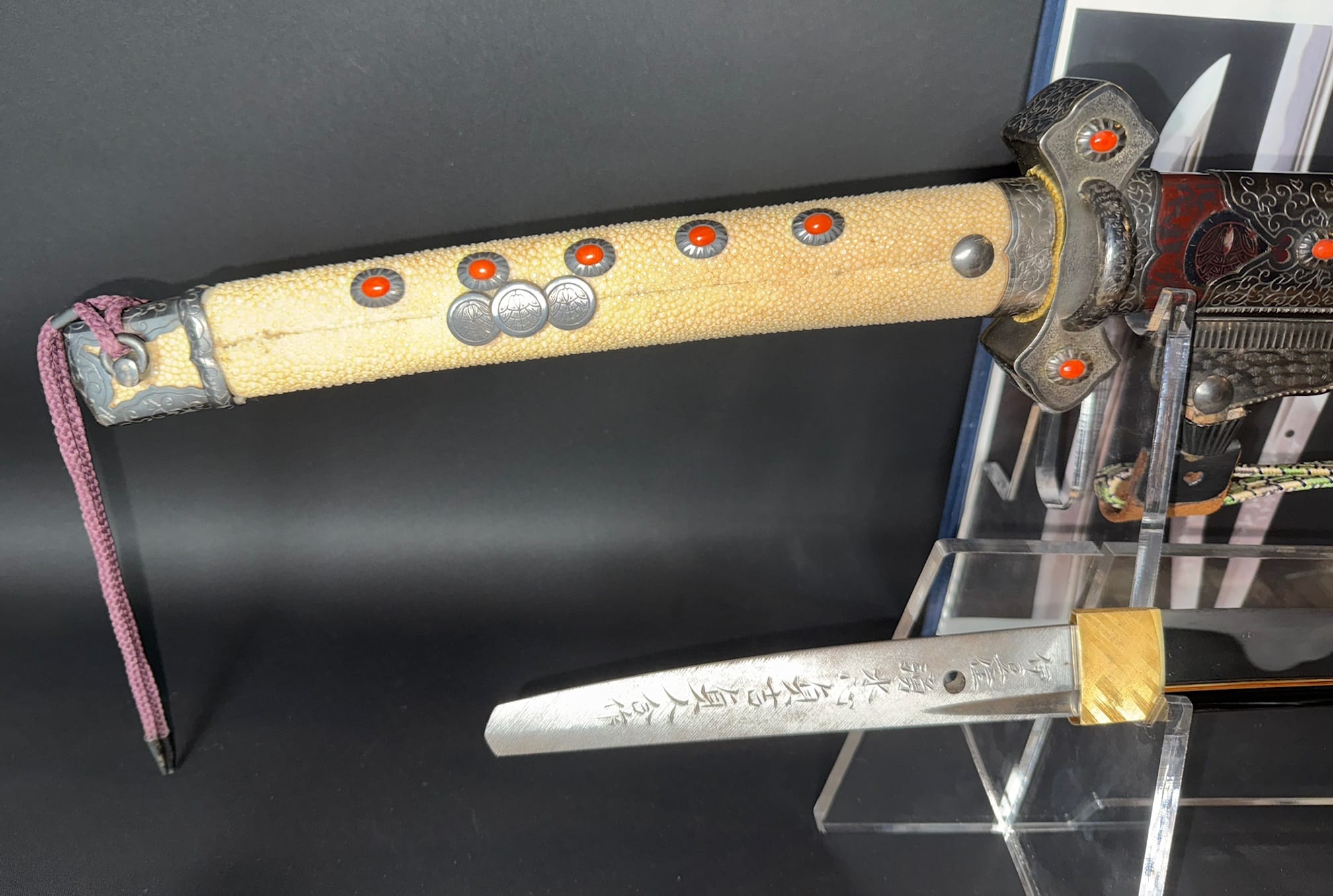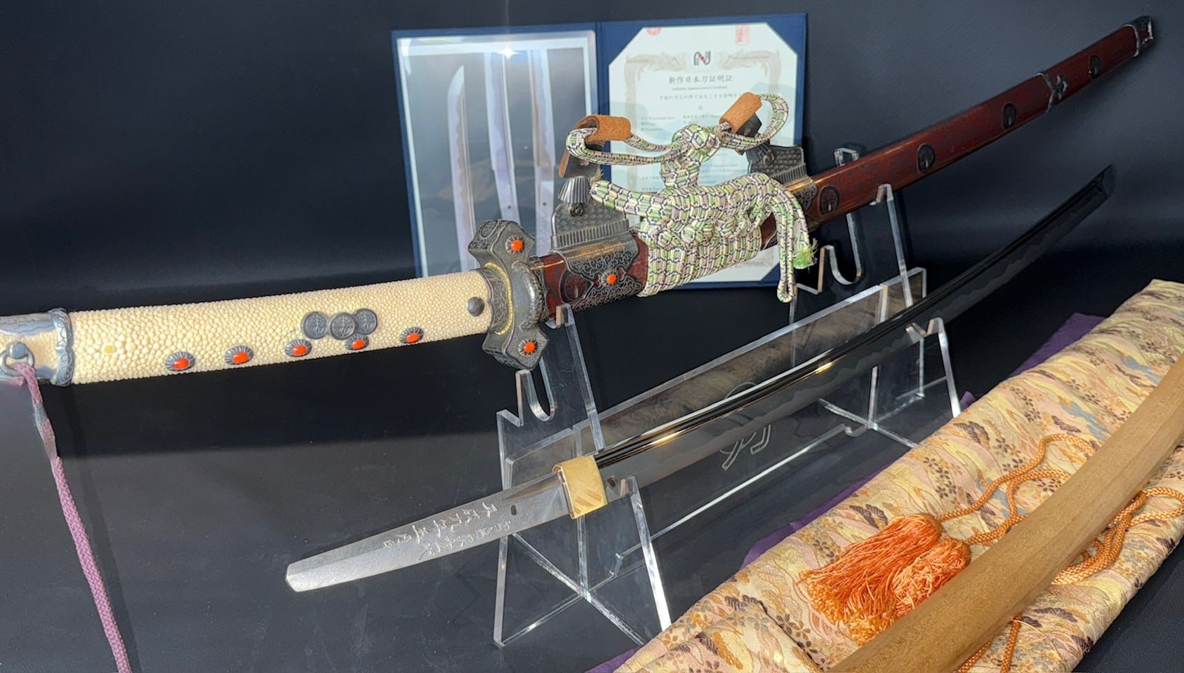 Beautiful Katana in Shirasaya with Tachi-style Koshirae(NBSK Certificate of Authenticity for Newly Made Japanese Sword)Signature: Izu ju Yusuishin Sadayoshi / Sadahito gassaku(Collaborative work by Sadayoshi and Sadahito)Date: May, 1997 (Heisei 9) – Miyajima Family HeirloomInscription: 伊豆住湧水心貞吉・貞人合作 (無監査刀匠) / 平成九年五月宮島家重代ClassificationJapanese swords are traditionally evaluated in four categories:Saijō Saku (Supreme Masterwork)Jōjō Saku (Upper Superior Work)Jō Saku (Superior Work)Regular Saku (Standard Work)This katana is ranked Jōjō Saku, an Upper Superior Work, for both Yusuishin Sadayoshi and Sadahito.Sword DetailsHabaki: Single-layered gold foil habakiBlade Length: 74.8cm (29.45in)Curvature (Sori): 2.0 cm (0.79 in)Mekugi-ana (Peg Hole): 1Width at Base (Motohaba): 3.38 cm (1.33 in)Width at Tip (Sakihaba): 2.56 cm (1.01 in)Thickness at Mune (Kasane): 0.6 cm (0.24 in)Weight: 855 gramsShape and ForgingA blade of imposing form, featuring a wide body (mihaba), thick spine (kasane), deep curvature (sori), and a long extended kissaki (point).A bohi (groove) is carved on both the omote and ura sides, lending the blade both elegance and balance.The jigane (steel surface) is a Nie-deki structure forged in the Sōshū-den tradition, displaying intricate grain and vitality.The hamon is a Nie-deki gunome-midare, forming a double wave pattern, rich in sunagashi (streaming lines) and kinsuji (golden streaks).The boshi (tip temper line) is midare-komi with hakikake, resembling brushstrokes of mist.Swordsmiths and LineageThis katana is a collaboration between Yusuishin Sadayoshi and Sadahito, two swordsmiths of the modern era.Yusuishin Sadayoshi (born 1908, Meiji 41) studied under the legendary Gassan Sadakatsu, inheriting the techniques of the Gassan lineage.In 1928 (Shōwa 3), he entered Sadakatsu’s forge and, in 1943 (Shōwa 18), moved to Mishima, Shizuoka, adopting the smith name “Wakimizu” (湧水心 – Pure Spring Water).Sadayoshi was renowned for selecting the pure spring water of Mount Fuji for his forging process, believing that crystal-clear water produced the most refined steel.His blades often show traces of the Gassan ayasugi-hada (flowing grain pattern), a hallmark of the Gassan school.Later, Sadayoshi achieved Mukansa status (exempt from competition judging) and received numerous honors, including the Masamune Award, one of Japan’s highest recognitions for swordsmiths.His collaborator, Sadahito, shared the same artistic spirit and technical mastery, creating a perfectly balanced fusion of tradition and modern excellence.Koshirae (Mounting)The sword is accompanied by a Tachi-style koshirae, refined and elegant in form.Saya (Scabbard): Decorated with the Daki Myōga family crest in silver inlay.Menuki: Carved with the Daki Myōga motif.Fittings: All metal fittings (kanagu) are engraved with the same crest.Theme: The mount is adorned with stone resembling coral, adding both color and rarity.Appraisal and RemarksThis piece represents a rare collaboration between two accomplished smiths, combining the refined forging methods of the Gassan tradition with the personal artistry of Yusuishin Sadayoshi.As a custom-ordered heirloom sword, the blade has been carefully polished, preserving its beauty and precision.The harmony of hada, hamon, and overall balance exemplifies the depth of modern Japanese craftsmanship rooted in centuries of tradition.Highly recommended as a collectible masterpiece.CertificationCertificate: NBSK Certificate of Authenticity for Newly Made Japanese SwordIncluded: Complete Oshigata (rubbing of the blade inscription and temper line)