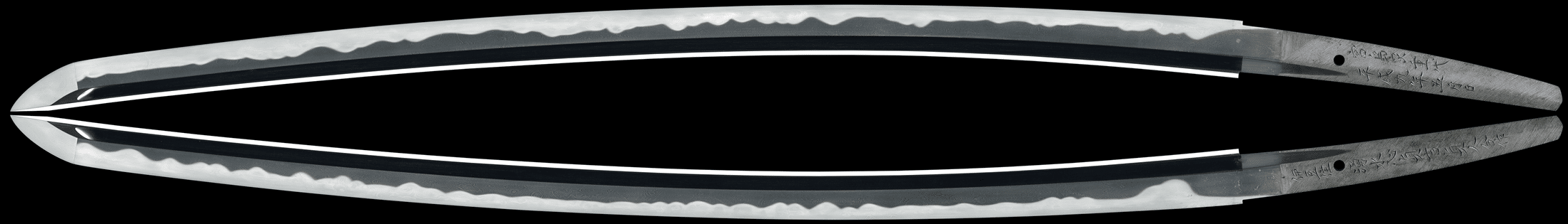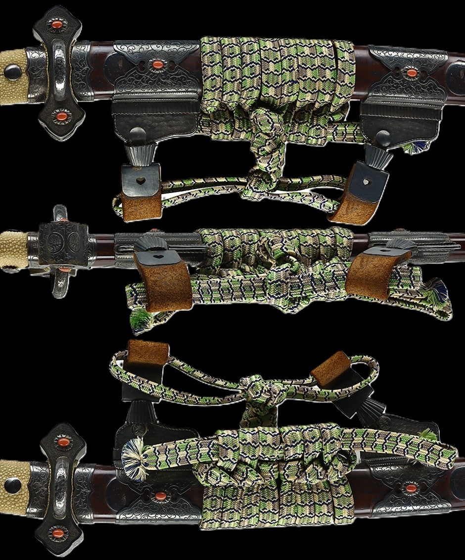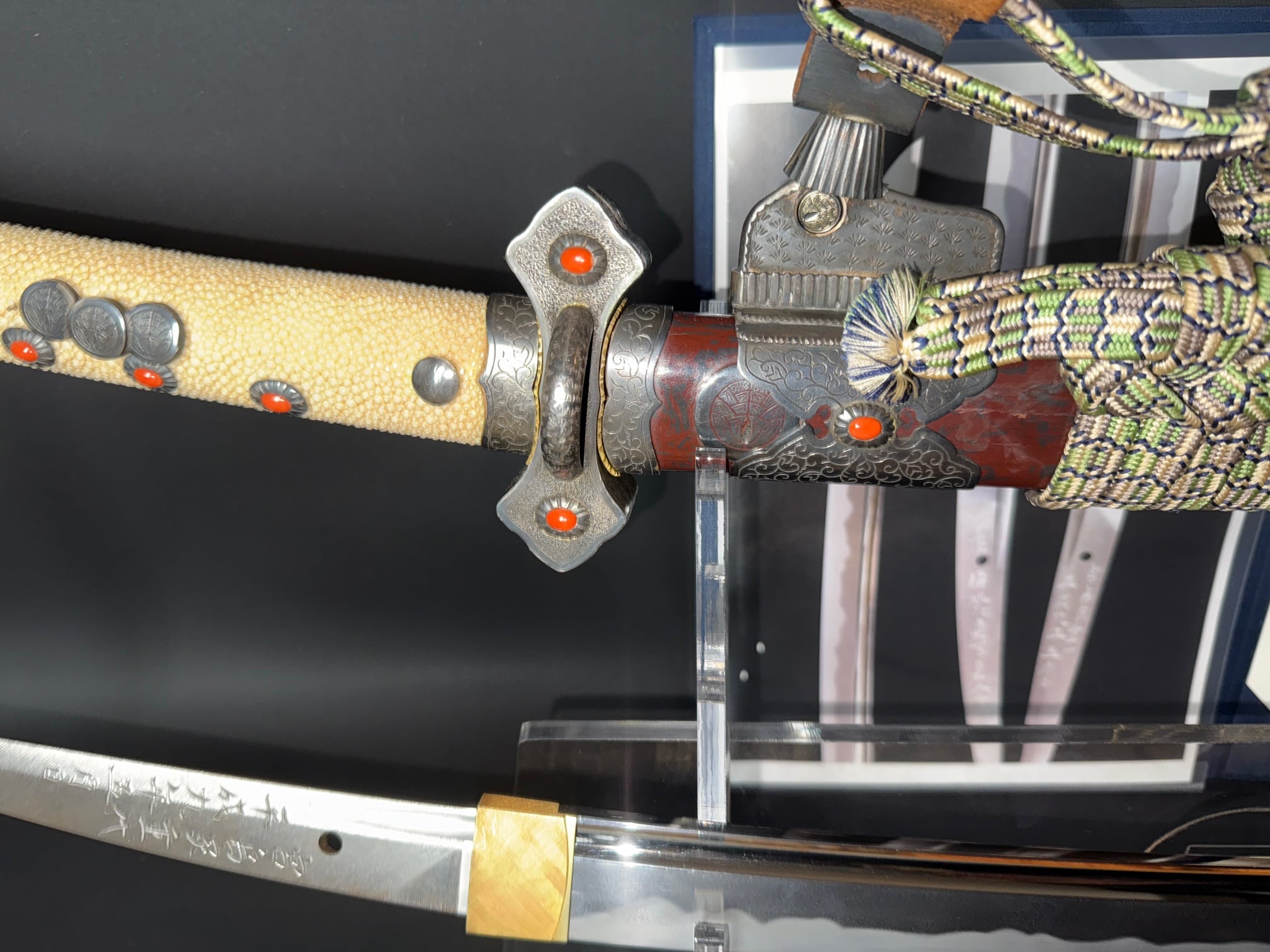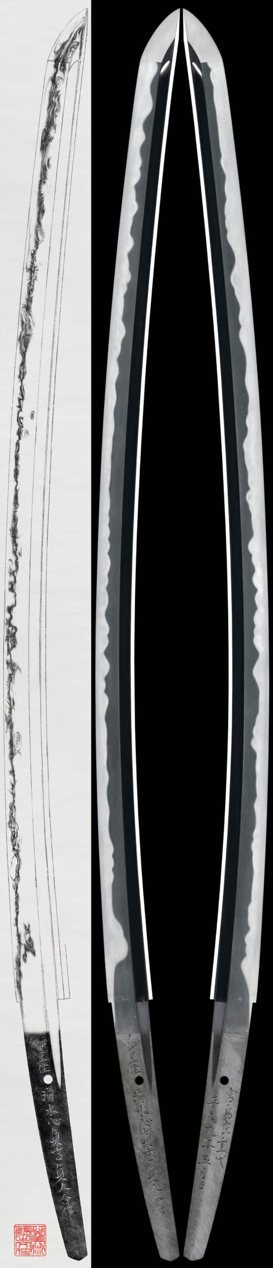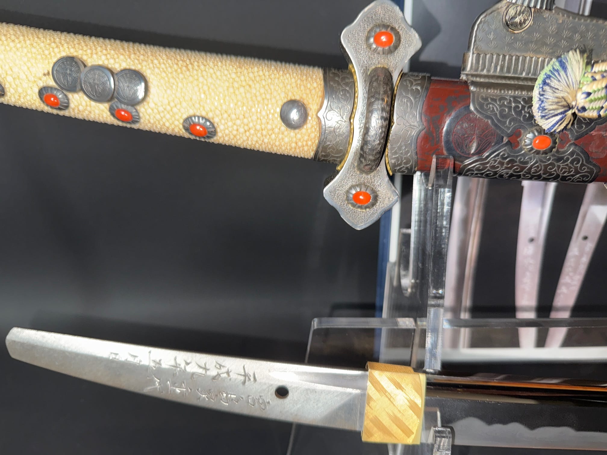 Beautiful Katana in Shirasaya with Tachi-style Koshirae(NBSK Certificate of Authenticity for Newly Made Japanese Sword)Signature: Izu ju Yusuishin Sadayoshi / Sadahito gassaku(Collaborative work by Sadayoshi and Sadahito)Date: May, 1997 (Heisei 9) – Miyajima Family HeirloomInscription: 伊豆住湧水心貞吉・貞人合作 (無監査刀匠) / 平成九年五月宮島家重代ClassificationJapanese swords are traditionally evaluated in four categories:Saijō Saku (Supreme Masterwork)Jōjō Saku (Upper Superior Work)Jō Saku (Superior Work)Regular Saku (Standard Work)This katana is ranked Jōjō Saku, an Upper Superior Work, for both Yusuishin Sadayoshi and Sadahito.Sword DetailsHabaki: Single-layered gold foil habakiBlade Length: 74.8cm (29.45in)Curvature (Sori): 2.0 cm (0.79 in)Mekugi-ana (Peg Hole): 1Width at Base (Motohaba): 3.38 cm (1.33 in)Width at Tip (Sakihaba): 2.56 cm (1.01 in)Thickness at Mune (Kasane): 0.6 cm (0.24 in)Weight: 855 gramsShape and ForgingA blade of imposing form, featuring a wide body (mihaba), thick spine (kasane), deep curvature (sori), and a long extended kissaki (point).A bohi (groove) is carved on both the omote and ura sides, lending the blade both elegance and balance.The jigane (steel surface) is a Nie-deki structure forged in the Sōshū-den tradition, displaying intricate grain and vitality.The hamon is a Nie-deki gunome-midare, forming a double wave pattern, rich in sunagashi (streaming lines) and kinsuji (golden streaks).The boshi (tip temper line) is midare-komi with hakikake, resembling brushstrokes of mist.Swordsmiths and LineageThis katana is a collaboration between Yusuishin Sadayoshi and Sadahito, two swordsmiths of the modern era.Yusuishin Sadayoshi (born 1908, Meiji 41) studied under the legendary Gassan Sadakatsu, inheriting the techniques of the Gassan lineage.In 1928 (Shōwa 3), he entered Sadakatsu’s forge and, in 1943 (Shōwa 18), moved to Mishima, Shizuoka, adopting the smith name “Wakimizu” (湧水心 – Pure Spring Water).Sadayoshi was renowned for selecting the pure spring water of Mount Fuji for his forging process, believing that crystal-clear water produced the most refined steel.His blades often show traces of the Gassan ayasugi-hada (flowing grain pattern), a hallmark of the Gassan school.Later, Sadayoshi achieved Mukansa status (exempt from competition judging) and received numerous honors, including the Masamune Award, one of Japan’s highest recognitions for swordsmiths.His collaborator, Sadahito, shared the same artistic spirit and technical mastery, creating a perfectly balanced fusion of tradition and modern excellence.Koshirae (Mounting)The sword is accompanied by a Tachi-style koshirae, refined and elegant in form.Saya (Scabbard): Decorated with the Daki Myōga family crest in silver inlay.Menuki: Carved with the Daki Myōga motif.Fittings: All metal fittings (kanagu) are engraved with the same crest.Theme: The mount is adorned with stone resembling coral, adding both color and rarity.Appraisal and RemarksThis piece represents a rare collaboration between two accomplished smiths, combining the refined forging methods of the Gassan tradition with the personal artistry of Yusuishin Sadayoshi.As a custom-ordered heirloom sword, the blade has been carefully polished, preserving its beauty and precision.The harmony of hada, hamon, and overall balance exemplifies the depth of modern Japanese craftsmanship rooted in centuries of tradition.Highly recommended as a collectible masterpiece.CertificationCertificate: NBSK Certificate of Authenticity for Newly Made Japanese SwordIncluded: Complete Oshigata (rubbing of the blade inscription and temper line)