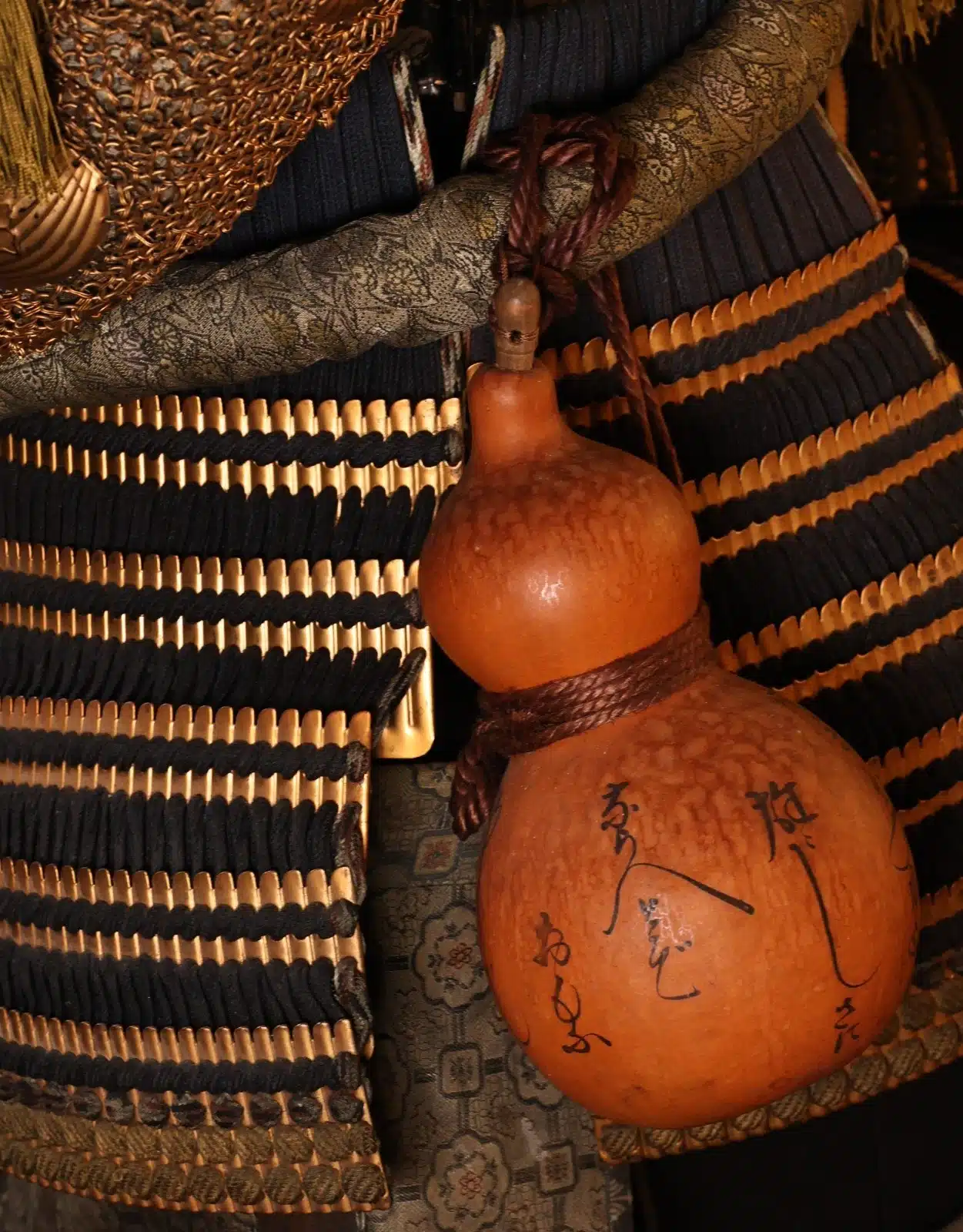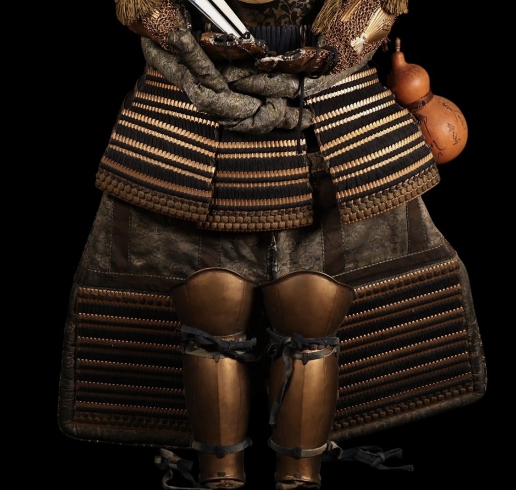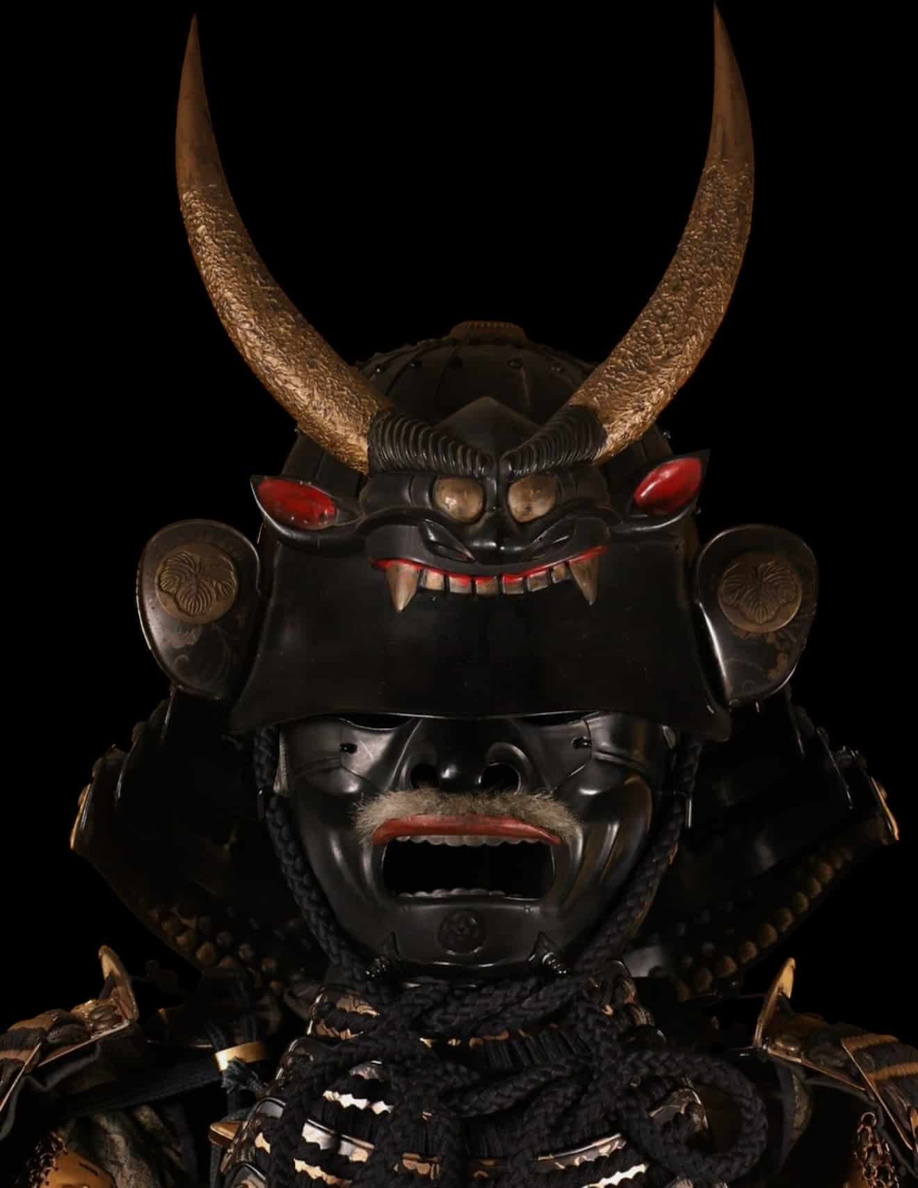 This impressive Japanese iron samurai armor (yoroi/gusoku) dates from the transitional period between the late Edo and early Meiji eras, a time when traditional martial culture was still meticulously preserved despite Japan’s rapid modernization. The armor is accompanied by its original yoroi-bitsu (armor storage chest), decorated with the distinguished Ishimochi-Jinuki Tsuta kamon, an ivy-family crest traditionally associated with resilience, longevity, and deep-rooted strength.