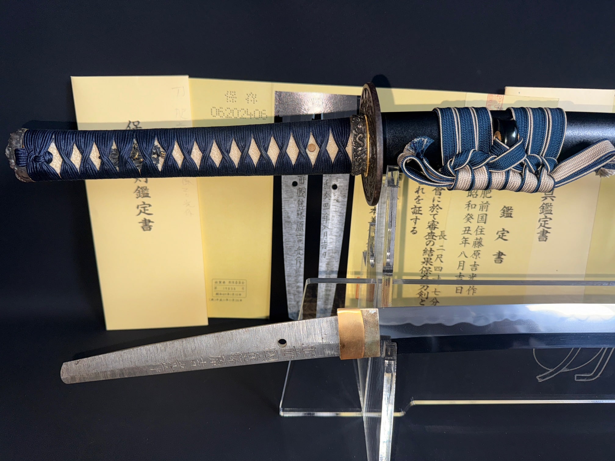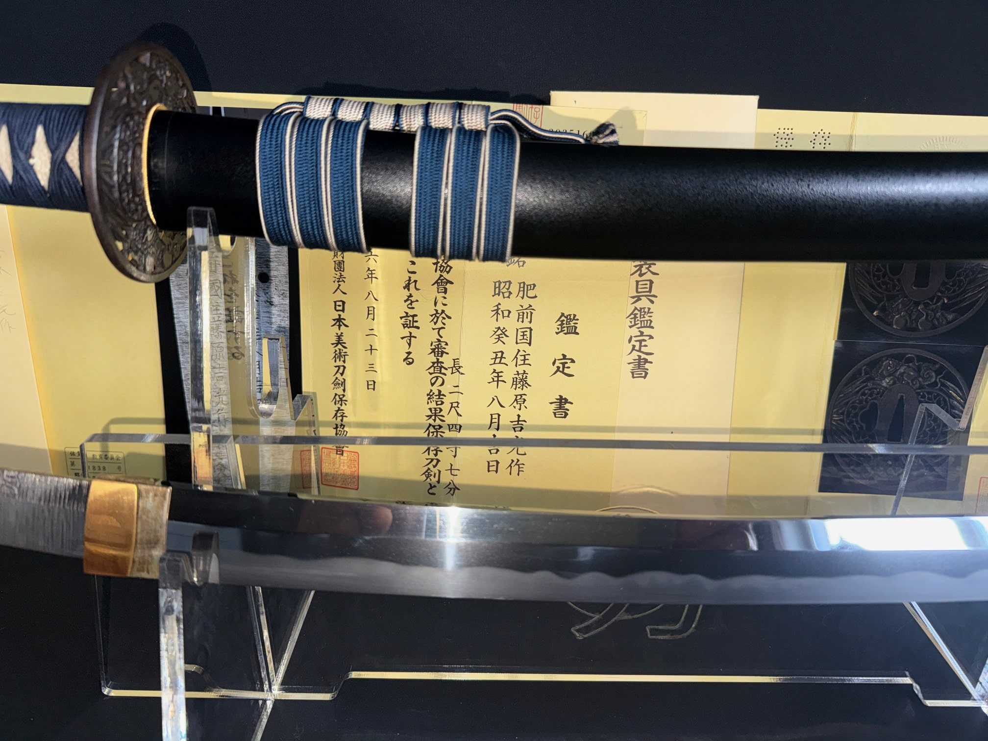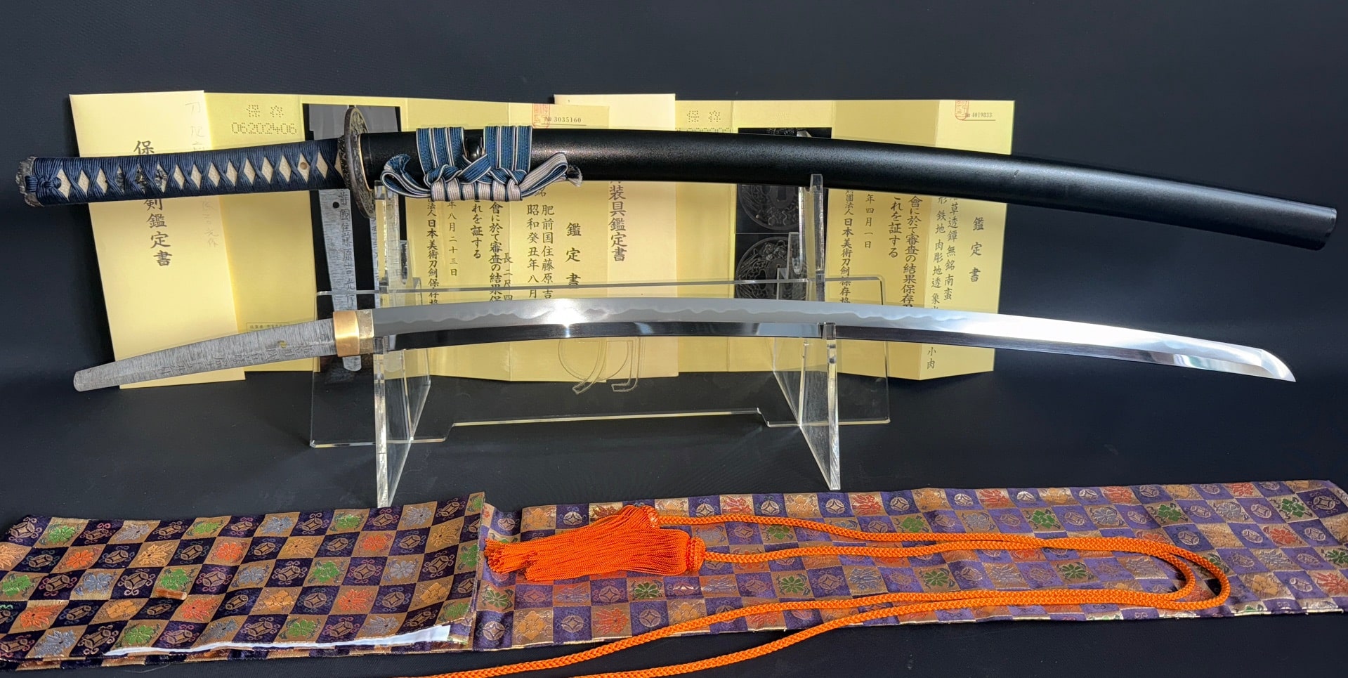 The Katana Hizenkoku Yoshimitsu is a remarkable example of postwar Japanese sword craftsmanship, forged by the skilled swordsmith Fukuda Mitsuo, who signed his works as Yoshimitsu. This fine sword embodies the enduring traditions of Hizen-style workmanship, combined with the technical precision and refined artistry of one of Japan’s notable Showa-era smiths.