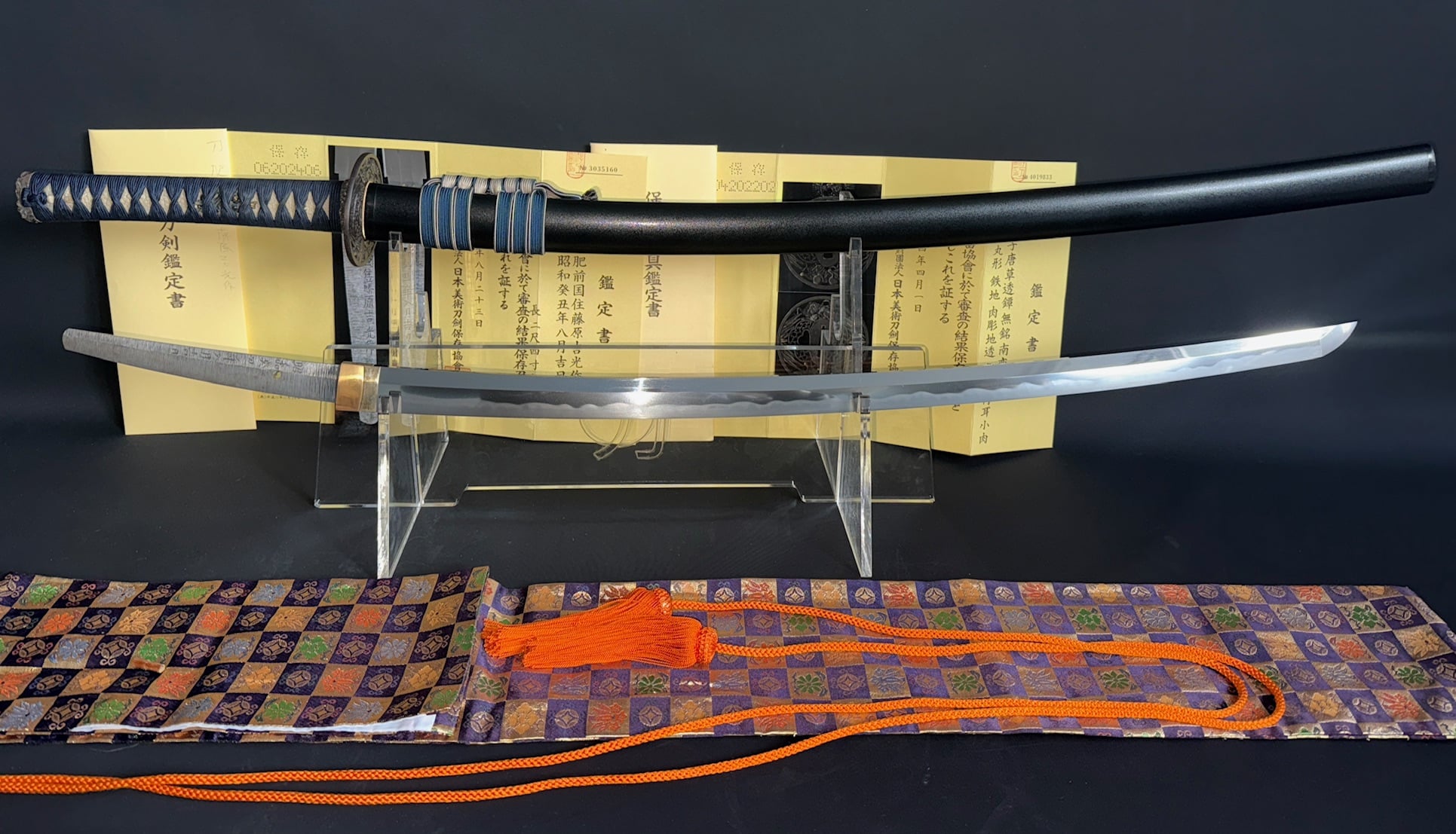 The Katana Hizenkoku Yoshimitsu stands as a testament to the refined skill and creative vision of Fukuda Mitsuo. The blade exhibits exceptional harmony between form and function — a hallmark of Hizen craftsmanship. With its elegant curvature, precise geometry, and masterful steel structure, this sword exemplifies the continuity of Japan’s swordmaking legacy into the modern era.