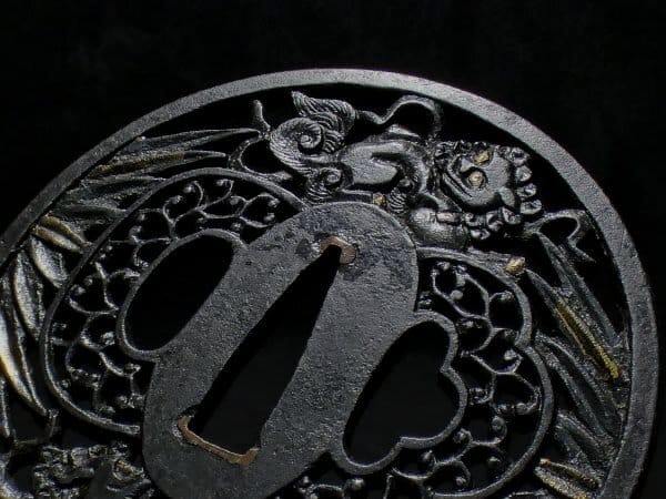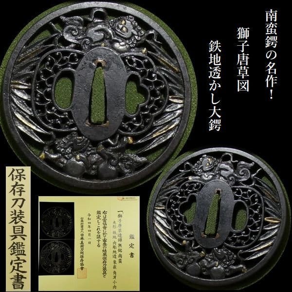 The sword is mounted with a Nanban-style tsuba featuring a lion and arabesque design, accompanied by its own NBTHK Hozon paper. The tsuba measures approximately 8.41 × 8.40 × 0.43 cm and weighs around 117 grams, reflecting a high level of decorative and functional balance.