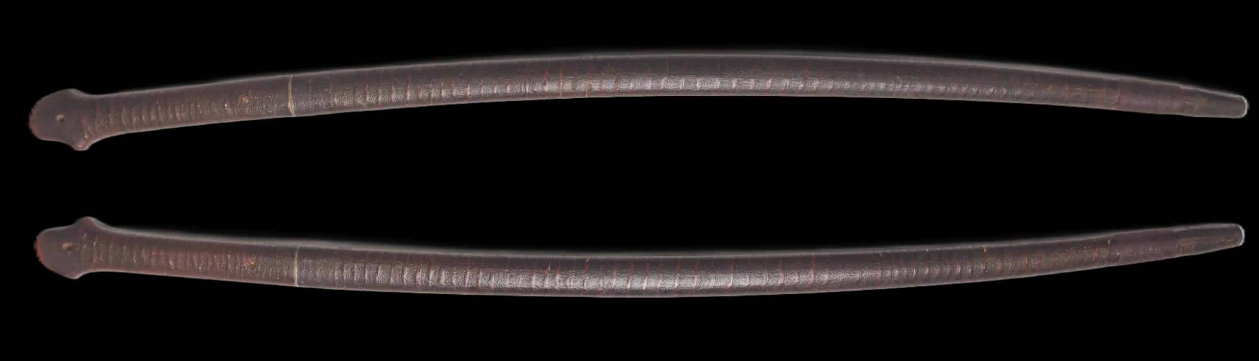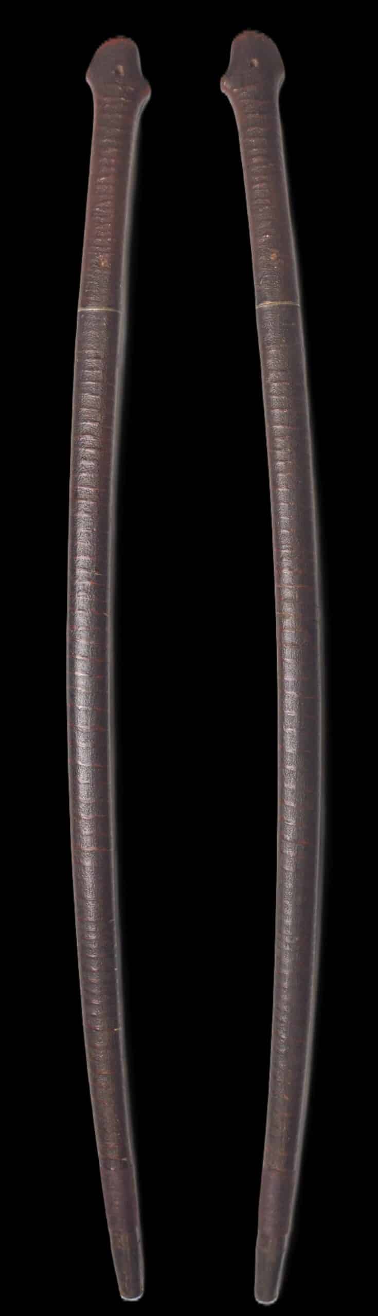 The shikomizue mounting is both historically meaningful and visually striking. Finished in dark brown lacquer, it features a subtle textured surface with a gentle spiral “rattan-like” pattern that gives the saya the genuine appearance of a walking cane. An iron reinforcement plate at the base supports its practical functionality, further emphasizing its dual-purpose design. This understated form evokes Meiji-period discreet self-defense culture and recalls iconic depictions such as Zatōichi, the legendary blind swordsman known for his concealed sword-cane.