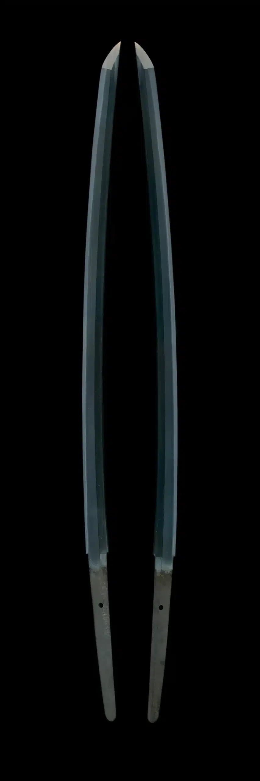 The hamon is a clean, straight suguha executed in nie-deki. The nie crystals along the edge are exceptionally fine and brilliantly reflective, forming a bright, polished line that runs evenly from the machi to the tip. Their clarity reflects the smith’s precise heat management during quenching, a hallmark of mastery achieved only through long experience. The overall aesthetic is one of restraint and refinement—an understated blade that rewards close study with depth and brilliance.